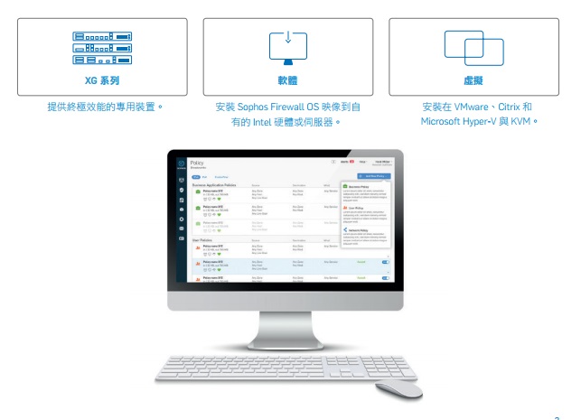 結合Sophos Firewall Manager 提供全功能的集中式管理,並有硬體、軟體或虛擬設備等多種款式可供選擇